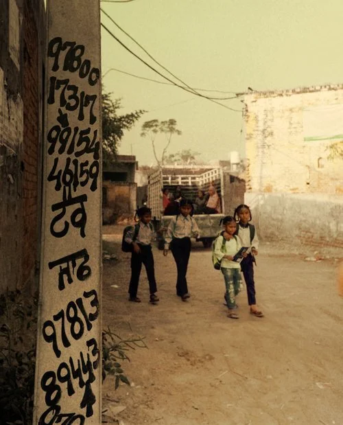 This film photograph taken in Panjab in October 2022 captures 4 girls going to school on an early morning. Behind them, four women head to work in an open truck.