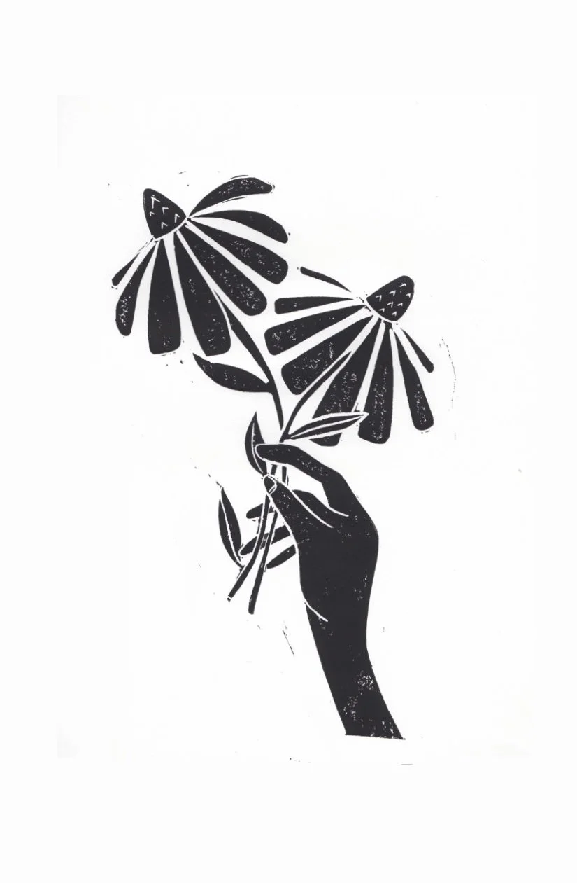 An original, hand-carved and hand-printed bouquet of echinacea created using modern block-printing techniques.
